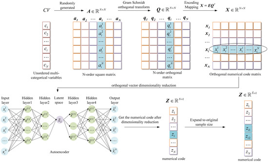After the encoding of unordered multi-categorical variables, input the orthogonal matrix of numerical codes into the autoencoder for representation learning and dimension reduction.