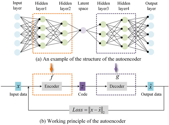 An autoencoder (AE) [28] is an unsupervised neural network model, which mainly consists of two parts, an encoder and decoder, and has a symmetric structure. Through neural network training, an autoencoder can achieve the tasks of data denoising, feature learning, or data dimensionality reduction [29].