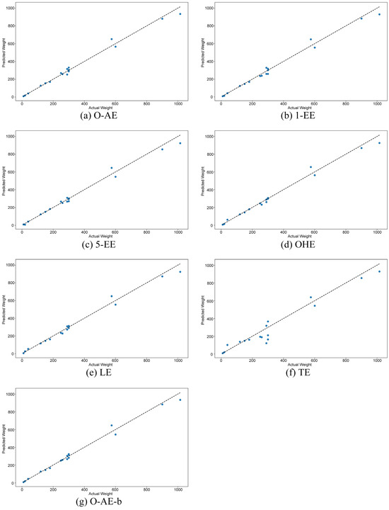 In the Fish dataset, the MAE results obtained by OHE are the best, the RMSE and results obtained by O-AE-b are the best, and the MAE results of O-AE-b are the best among the seven experiments except for OHE. The RMSE and results of O-AE are also the best among the seven experiments except for O-AE-b. The results of all three metrics for TE are worse in the other experiments.