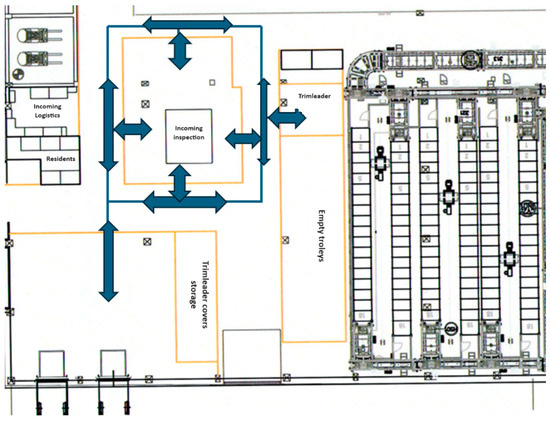 The calculation in the table was determined using the width of the individual automated guided vehicles, in the case where the towing automated guided vehicle is 0.67 m and in the case of the forked automated guided vehicle, we considered the dimension of the box, which is larger than the trolley itself, i.e., 1 m. The suitability column was determined as the sum of the width of the individual deployed automated guided vehicles, e.g., for an aisle with a width of 3.013 m (the aisle at the material-sorting workplace, it is also the same aisle where the push carts for coating should be stationed) we consider the deployment of 2 lanes for pulling automated guided vehicles, i.e., 2 × 0.67 and 1 lane for fork automated guided vehicles, so the total space occupied is 2.34 m. The reason for deploying two lanes is due to the reason that if a towing trolley would perform an action on the front line and come back to the workstation, where at the same moment a back-line trolley would want to start performing the action, the back-line trolley would have to wait for the front-line trolley to come back to the sorting workstation.