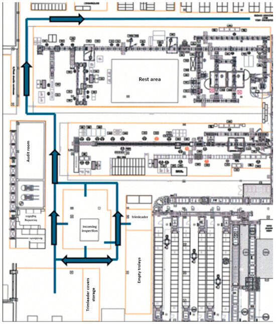 According to Table 8, we measured the front line as 2 separate workstations, we first measured the time interval per labelled FC workstation. Then, we restarted the timing measurement and measured the movement from the labelled FC workstation to the labelled FB workstation. Consequently, as shown in Table 8, we then merged the given measurement into 1 circuit, i.e., the complete time to service the entire front line, i.e., workstations labelled FC and labelled FB. The reason for merging these into 1 circuit is also that a worker with 1 load and sequenced material serves both workstations, where in the case of the back line, a worker with 1 trolley serves 1 workstation of the back line, labelled RB.