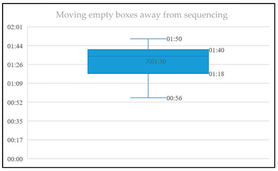 According to Table 6, the worker travels varying distances to the sequencing workstation due to the fact that the prepared material box may be closer to or directly on the quality control workstation, so in some cases the worker had to travel a slightly greater distance. We also refer to the possible positions/start of the relocation of the boxes to the sequencing workstation in Figure 3. We can only describe these changes in the manipulation path by measuring the duration over time. It is not possible to characterise them by the frequency of the occurrence of boxes at other workplaces in the production hall. Therefore, by using these statistically averaged values, we can generalise these processes and look for automation possibilities on the shop floor.
