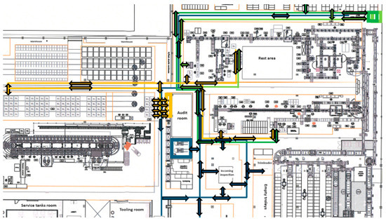 Figure 12 shows the final design of the stationing and routes of the proposed automated guided vehicles. In Figure 12, we have also added one more route (dark yellow) to minimise the waiting time during the reverse movement of the returning trolleys. Thus, the hauling carts with foams would not be blocked and would not have to wait unnecessarily for one automated guided vehicle to return at the empty cart drop-off; by having one more route there, unnecessary downtime would be minimised. Based on the suggestion in Figure 12, we also performed an analysis to determine if the individual aisle widths would be sufficient for that many automated guided vehicle routes. The individual analysis will be shown in Table 21.