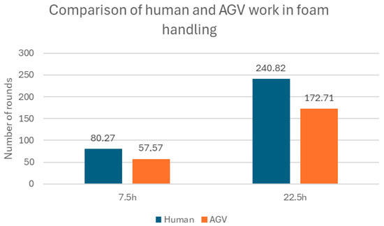To complete the evaluation, we performed an analysis of how many processes or circulations would be performed by the applied AGVs compared to a human. The individual comparisons are shown in the Figure 13 below.