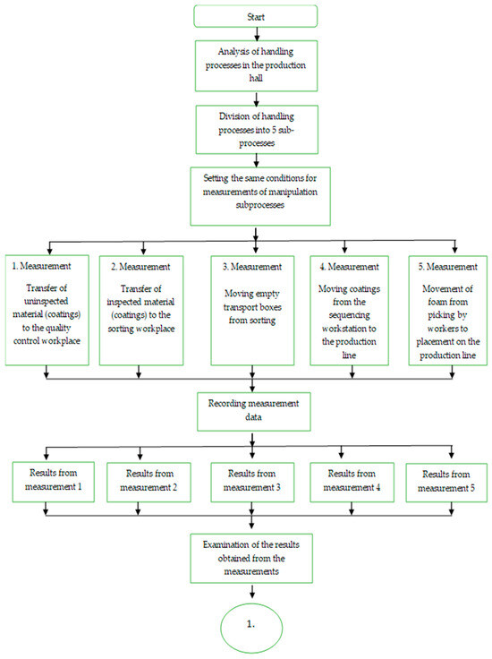 Based on measurement 1, it is possible to define the average times of the individual manipulation processes in the hall. Based on Figure 2, we can determine that the total measurements are the following: