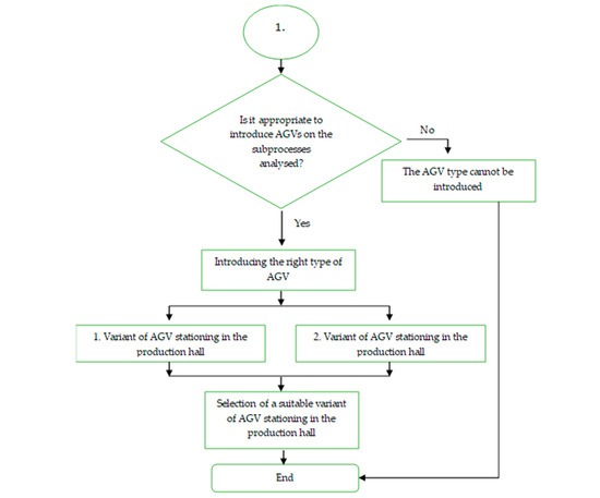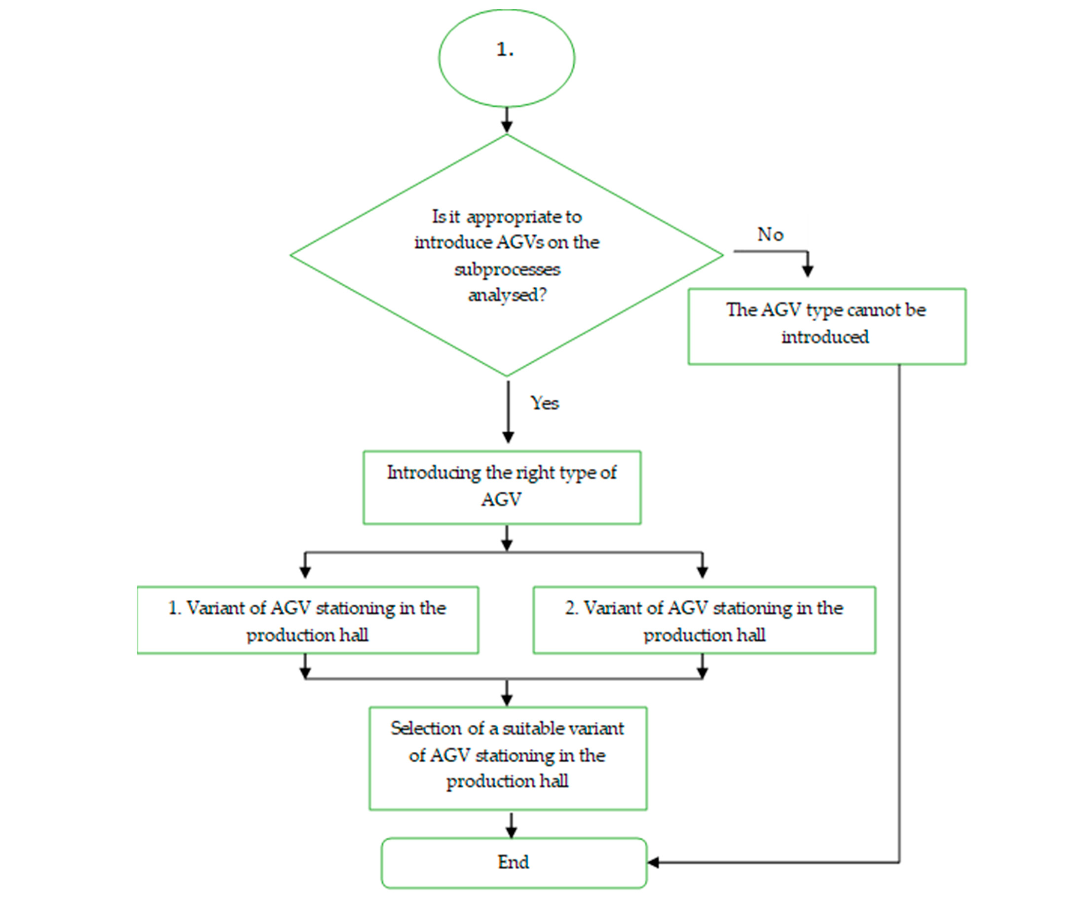 Based on our case study, we proposed a methodology for the implementation of AGVs in a production hall. Our methodology consists of an in-depth analysis of the existing logistics processes required for a 24/7 material secure production hall. This is a very specific environment of an existing production, complemented by the supply of the production line. Based on the analysis of the existing material handling, we divided these processes into five sub-processes, which we examined separately. The measurement conditions were set in the same way. The material handling was studied under the same conditions and the measurement results were analysed in detail. The detailed procedure in the individual steps of our research is presented in the flow chart in Figure 14. Based on the results of the measurements, we asked ourselves three basic questions, which we tried to answer.