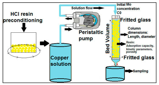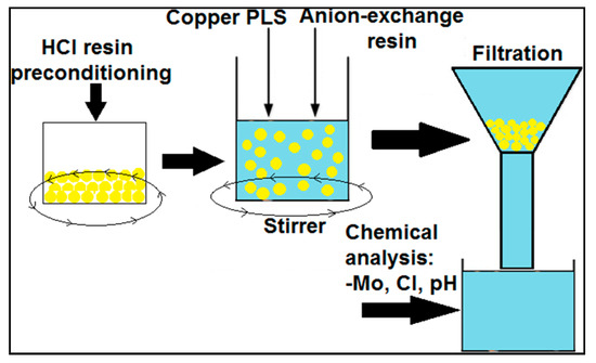 Since copper is the foundation of Chile’s mining industry, it is critical to underline that the fundamental condition for completing this project is that the composition of the copper−bearing solution cannot be changed. For this reason, the ion exchange method was the best choice. The experimental development of this work comprised two stages: static− and continuous−type tests. Figure 3 illustrates the static tests [43]: