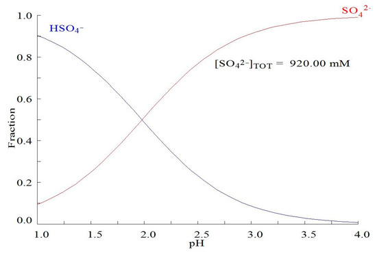 The above process description shows that the concentration of chlorides is closely related to the total process efficiency. If this ion is present in high concentrations, the adsorption mechanism stated in Equation (2) will be severely constrained. As a result, it is critical to understand the effect of chloride ions on the overall process. Given that the copper PLS solution had a natural concentration of around 10 g/L, it is critical to compare the performance of the continuous adsorption curves for real and synthetic PLS solutions without chlorides. Finally, the best performing resin was tested with temperatures of 40 °C and 55 °C to increase the molybdenum yield. Although the molar concentration of sulfates in the copper PLS was higher than the chlorides, their presence is not as detrimental as the chloride ions. This was because of the sulfate speciation shown in Figure 4. According to this figure, SO42− ions are mostly present as HSO4− ions. At pH values of 1.0–1.5, the ion exchange resin loses selectivity towards sulfates because the anion−exchange resins are less selective towards the ion HSO4− than sulfates [45,46,47].