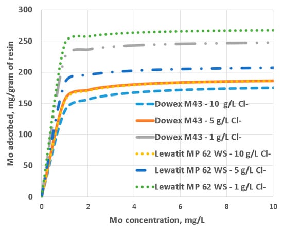 Table 2 shows the chemical analysis of the synthetic copper PLS used in the assays, which was carried out at room temperature (25 °C). The chemical composition of the PLS solutions used for all the tests was determined using inductively coupled plasma mass spectrometry (ICP−MS). The molybdenum adsorbed at the resin’s surface was determined using the difference in molybdenum concentrations from the initial and final solutions. Since the chloride concentration in the copper PLS solution changes substantially during the industrial operation, it is necessary to study its influence on the molybdenum adsorption results, and to a lesser degree, the process’s performance may be hindered by the presence of ferrous ions and zinc. For this reason, the effect of three different concentrations of chloride ions in synthetic solution was also investigated: 1, 5, and 10 g/L.