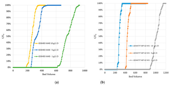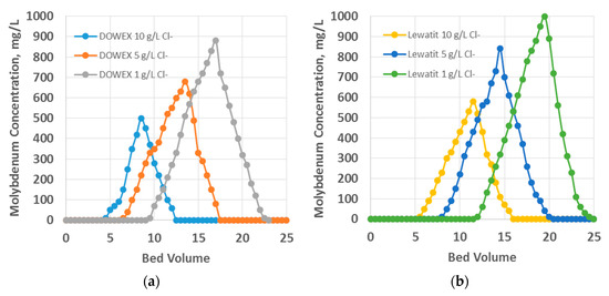 Figure 8a,b show the results of the continuous ion adsorption tests. Because of their affinity for anion−exchange resins and their abundance in solution, chloride ions occupy the bulk of anionic resin active sites. At low concentrations of chlorides in solution (1 g/L Cl−), the resins reached breaking points were 620 BV for the DOWEX M43 resin and 891 BV for the Lewatit MP 62 WS resin. However, as the concentration of chlorides in solution increases, for 5 g/L Cl−, the breakpoints dropped to 250 BV for DOWEX resin and 405 BV for the Lewatit resin, and at high chloride concentrations (10 g/L), they dropped to 185 BV and 245 BV, respectively. These drops in the breakthrough points of the continuous ion exchange tests caused the original process to recover molybdenum to become economically unprofitable due to the high consumption of chemical reagents to carry out the subsequent molybdenum elution from the column.