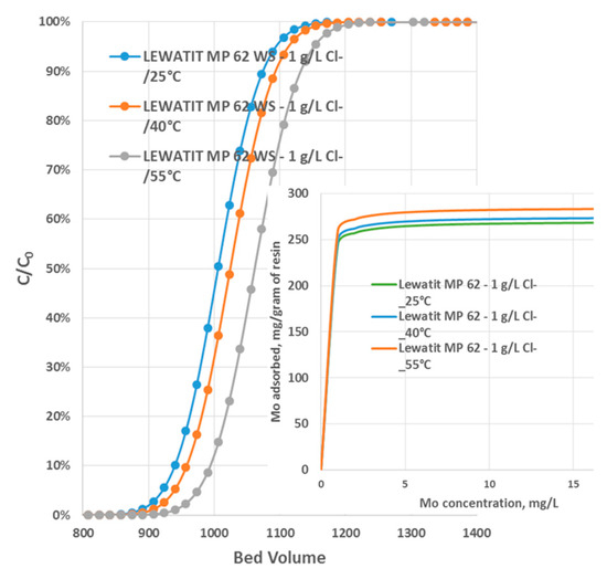 Figure 9 show the influence of the temperature on the continuous ion adsorption tests. The diffusion coefficient and the equilibrium conditions attained for the isotherms are both affected by temperature. Although working at room temperature is the most usual procedure in ion exchange, these two methods can boost molybdenum recovery yield. Though increasing this parameter can enhance the results, the rise in the breakthrough point from 890 BV at 25 °C to 907 BV at 40 °C and 940 BV at 55 °C was insufficient to justify the practical application. As a result, the process was carried out at room temperature.