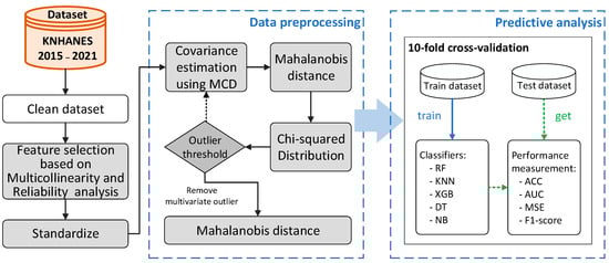 In this study, we leveraged Mahalanobis-distance-based outlier removal to enhance diabetes prediction models using the Korea National Health and Nutrition Examination Survey (KNHANES) dataset from 2015 to 2021 provided by the Korea Disease Control and Prevention Agency (KDCA) [15,16,17]. To address the complex interplay between the risk factors, we implemented feature selection based on multicollinearity (MC) [18,19] and reliability analysis (RA) [20] to refine the predictive variables. We applied this enhanced dataset to several machine-learning classifiers, including Extreme Gradient Boosting (XGBoost), Naive Bayes (NB), K-Nearest Neighbors (KNN), Random Forest (RF), and Decision Trees (DTs) [21]. The objective was to develop a comprehensive risk assessment model that integrates demographic, genetic, biochemical, and lifestyle variables, while effectively addressing the issue of outliers. Our empirical analysis demonstrates that the proposed approach significantly improves the model accuracy and robustness across all classifiers, with XGBoost showing superior performance.