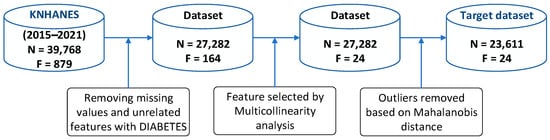 The KDCA collected the KNHANES data. These included health examinations for various diseases, health interviews, and nutritional surveys conducted in the Korean population. The KNHANES datasets were released for public use within one year from the end of each survey year. We generated a target value for individuals aged ≥ 19 years with diabetes. The target diabetes group included individuals with a history of hypertension, diabetes, heart disease, heart attack, or stroke. Our comprehensive study meticulously processed and analyzed the datasets derived from KNHANES. For the KNHANES (2015–2021), we initially obtained 39,768 records and 879 features. Through a rigorous screening process that excluded rows with missing values and features not pertinent to diabetes, coupled with MC and reliability analyses, we identified 24 features of critical relevance to diabetes. This careful curation resulted in a refined experimental dataset containing 27,282 records, each of which contained 24 diabetes-related features. After excluding the outliers using the MAH method, we obtained a target dataset with 23,611 records and 24 features. Figure 2 shows the procedure for creating the experimental target datasets for KNHANES (2015–2021).