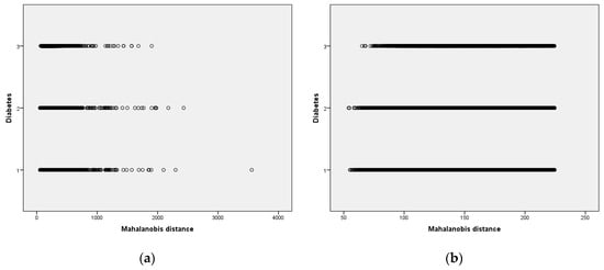 In this study, outliers were removed based on the MAH distance to detect multivariate outliers. We selected 37 diabetes-related features. The descriptions of these features are presented in Table 2. Figure 3 shows the data with and without outliers from the dataset, using several values based on the MAH method.