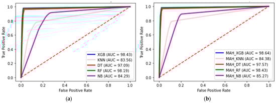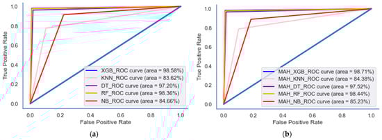 The accuracy, AUC, and F1-score of the performance results are presented in Table 6, with the highest scores highlighted in bold based on the k = 10 cross-validation. The XGB model exhibited the highest accuracy of 97.02%, which improved to 98.04% when MAH-based outlier removal was applied to the baseline model. The XGB and RF appear to perform well across multiple metrics, indicating that they are strong candidates for a given task. NB appears to have a lower accuracy and F1-score than the other algorithms, suggesting that it may not be the best choice for this specific task.