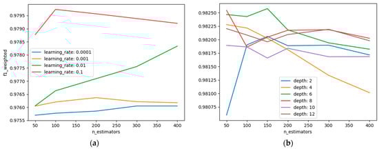 To improve the outcomes, we adjusted some XGBoost hyperparameters on a specific dataset by utilizing the grid search framework in scikit-learn [38,39]. Figure 6a displays a graph of the F1-weighted performance for each learning rate with variation in the number of trees. In addition, the data indicated that an optimal outcome was achieved when using a learning rate of 0.1 and 100 trees. The anticipated overall pattern remained consistent, with the performance improving as the number of trees increased.