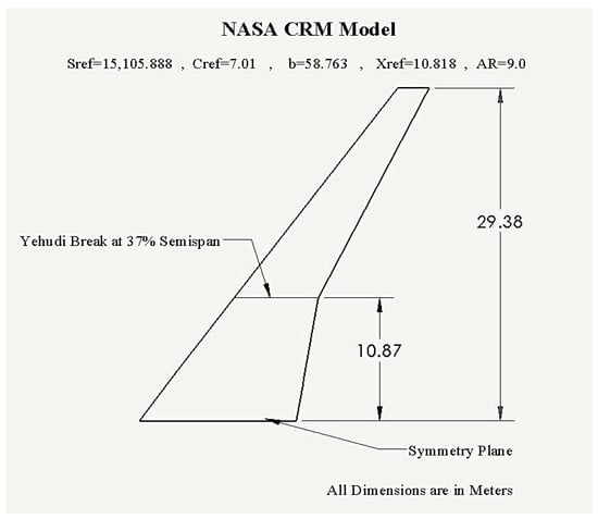 A transonic supercritical wing was developed as a common research model (CRM) for CFD validation studies by NASA and Boeing, as shown in Figure 1. The geometry and properties of the model are well established for a nominal 1-G wing at cruise. It is a low-wing configuration that cruises at 0.85 M and CL = 0.5 (Re = 4 × 107, Cref = 7 m and Sref = 383.69 m2) [28].