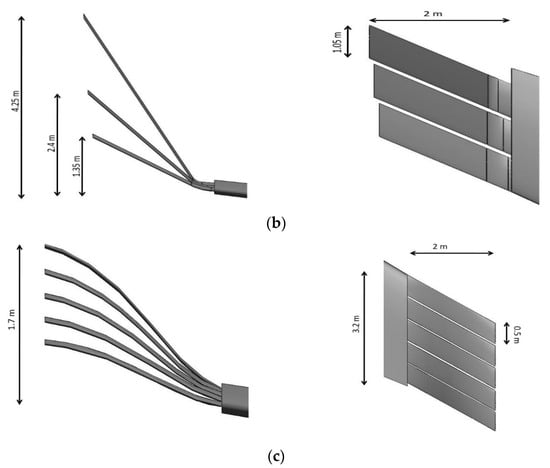 All winglets were designed based on the constraint that the projected wingspan be constant. Conventional winglets such as raked, blended, and wingtip fence winglets were modeled by referring to multiple research papers [6,8,9,10,13,19,29,30]. The designs from the mentioned literatures were used for comparison with this study’s novel winglet designs. The dimensions of the conventional designs are shown in Figure 2. The proposed and novel winglet designs such as twisted, multi-tip, and bird-type were modelled by representing the nature of a bird’s feather, as shown in Figure 3. The finger-like wingtips of birds help reduce induced drag by creating small vortices on each tip than forming a big vortex at the wingtips, which generally occurs in aircraft.