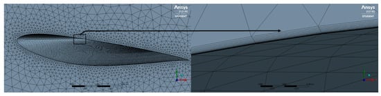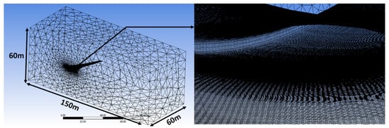 Airflow is represented as an unsteady, three-dimensional, compressible flow. The governing equations are continuity, x, y, and z-directional Navier–Stokes equations and energy equations. As it would be difficult to solve Navier–Stokes equations due to fluctuating components in the flow field throughout time, a decision was made to use the RANS equation. To solve the closure problem in the RANS equation, the Spalart–Allmaras model is used, as it was created expressly for aerospace applications [31], and it has been proven to perform well for boundary layers subjected to pressure gradients. It simply requires the solution of one transport equation, kinematic turbulent viscosity, which reduces computational complexity. Moreover, the Spalart–Allmaras model [32] has been thoroughly verified for exterior flows and shows good agreement with experimental data in aerospace applications. This study’s computational domain and mesh generation are shown in Figure 4 and Figure 5.