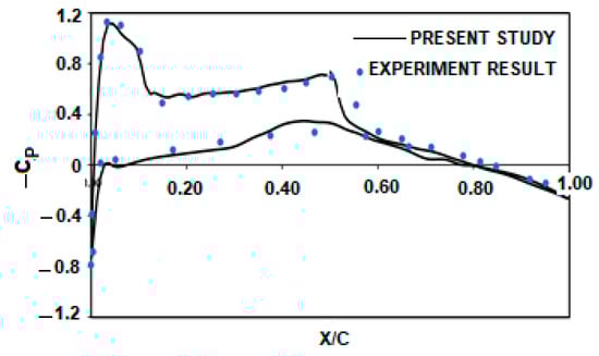 The test case of transonic flow over the ONERA M-6 wing [33] is predominantly used for validation purposes by numerous researchers. Therefore, the present computational method is compared with existing research on the ONERA M-6 wing. Analyses are performed for the flow conditions mentioned in Table 1. The CL and CD of this study are compared with Crovato et al. [34], Durrani et al. [35], Moigne et al. [36], Neilsen et al. [37], and Rho et al. [38], Radespiel [39], Hyoungjin and Oh-Hyun [40] the maximum deviations for both the cases are in the acceptable range of around 6.98% and 7.13% respectively. Furthermore, the computational results are compared with experimental results [34] conducted by the AGARD (Advisory Group for Aerospace Research and Development). The Cp vs. X/C graph is plotted at a semi-span of 44% from the root chord, as shown in Figure 6, and the results are in good agreement.
