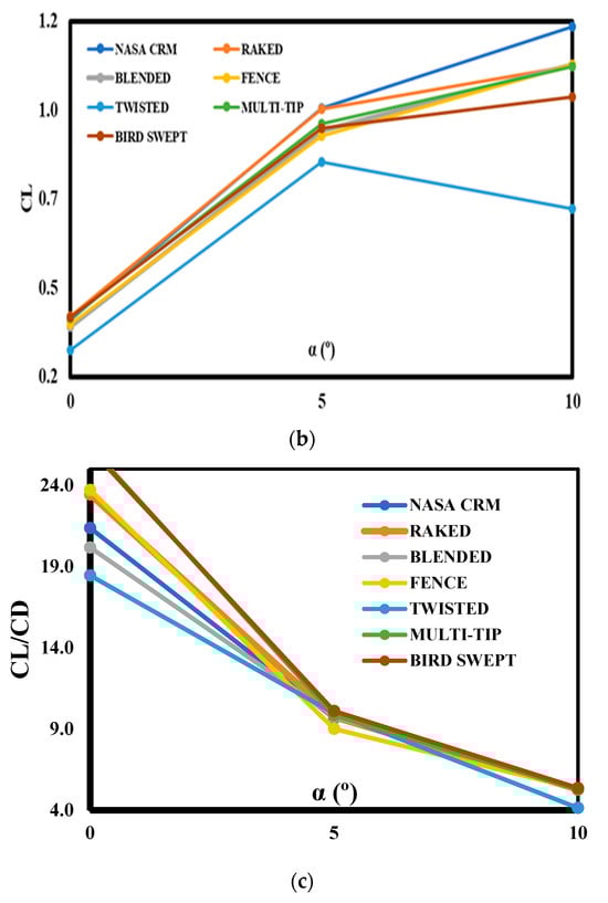 The effect of attack angles on (a) drag coefficient, (b) lift coefficient, and (c) CL/CD for different winglet designs.