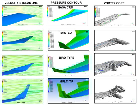 Winglet designs are analyzed at 0.85 M and a Re of 40 × 106 (Cref = 7 m and Sref = 191.845 m2) for angles of attack at 0°, 5°, and 10°. Aerodynamic coefficients such as CL and CD are noted and compared with the baseline model, as shown in Table 2. It can be observed from Table 2 that the twisted, multi-tip, and bird-type winglets outperform other types of winglets with improved CL/CD for all three attack angles. From the results shown in Figure 8, it is evident that a multi-tip winglet at a zero-degree angle of attack outperforms other winglet designs, and its aerodynamic efficiency is 23.47% better than the baseline model, followed by the bird-type winglet with an improvement of 22.83%. At a 5° angle of attack, bird-type, twisted, and multi-tip winglets show improvement in CL/CD by 4.53%, 3.05%, and 1.89%, respectively. At a higher-degree angle of attack, α = 10°, the bird-type winglet performs better than the baseline model by 0.67%. The aerodynamic efficiency decreases as α increases due to increased drag [39]. In particular, the multi-tip and bird-type winglets have positive twist angles, thus leading them to stall at higher α. An appropriate twist angle at the wingtips could resolve this issue. It is concluded from the first-stage analyses that multi-tip and bird-type winglets perform better than the other designs. Although the bird-type winglet performs marginally better than the multi-tip winglet, the parametric study is conducted on the multi-tip winglet, as it is relatively easier to parameterize the design [40]. The flow over each design is investigated using streamline, pressure contour, and vortex core, as shown in Figure 9. The presence of shockwave is observed along the mid-span of the wing. It is also observed that there is no sudden drop in velocity and rise in pressure over the multi-tip winglet, thus resulting in less wave drag compared to other winglet designs.
