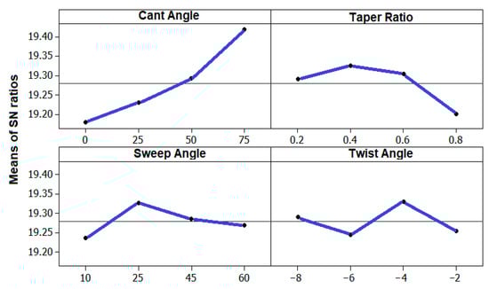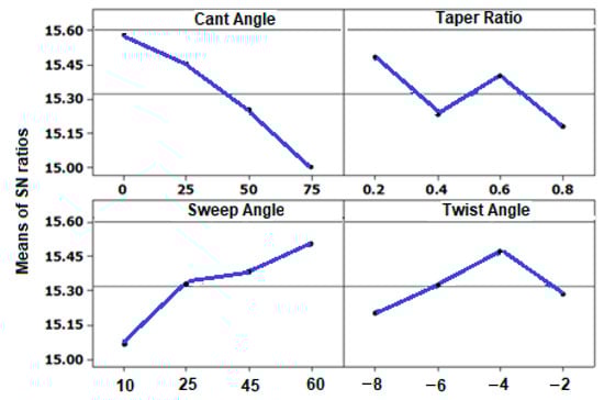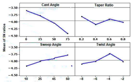 Taguchi analysis predicted that for the CL/CD response, the sweep angle has the highest significance followed by twist angle, taper ratio, and tip angle, as shown in Table 6. The above prediction is examined for CL/CD, which is considered based on the larger-the-better criterion, and the variations in the S/N ratio for different parameters at the CL/CD condition is shown in Figure 11. As expected, CM is influenced the most by tip angle, followed by sweep angle, twist angle, and taper ratio, as shown in Table 7. Overall, the cant angle is the most important parameter for the aerodynamic coefficients. This prediction is observed for the CM response, which is considered based on the smaller-the-better criterion, and the variations in the S/N ratio for different parameters at the CM condition is shown in Figure 12. The variations in the S/N ratio for different parameters at the dependent parameter (CL/CD)/|CM| condition is shown in Figure 13, which shows the predicted response (CL/CD)/|CM|, which is highly influenced by tip angle, followed by tip ratio, sweep angle, and taper angle based on the larger-the-better criterion, as shown in Table 8.