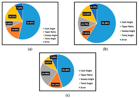 Similarly, for the response (CL/CD)/|CM|, the contribution of error percentage is less than the other input parameters considered for this transonic wing design, which results in the optimum response of (CL/CD)/|CM|. From Table 11 and Figure 14, the cant angle is the most dominant parameter in the transonic wing design followed by sweep angle, taper ratio, and twist angle, which determine the optimum dependent response parameter of the CM value.