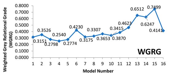 The results of ANOVA for the weighted grey relational grade are listed in Table 17. It shows that the sweep angle is the most dominant process parameter affecting the multiple responses due to its highest percentage contribution among the process parameters, followed by twist angle, cant angle, and taper ratio, respectively. It may be noted that the minimum error percentage on the responses is observed. The appearance of the minimum error percentage indicates that the effects of all the input process parameters involved in different weightage are mostly involved to obtain the optimum output responses of the design [48,49].