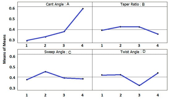 Hence, the higher level of mean responses of the transonic wing is selected as the optimum condition of the winglet design. The best combination of the winglet design of transonic design is identified with A4 (cant angle of 75°), B2 (taper ratio of 0.2), C2 (sweep angle of 25°), and D2 (tip twist of −2°) from the 16 combinations of the experiments. Thus, the optimum value of WGRG is estimated based on the literature [44]. The response table for the weighted grey relational grades shown in Table 16 and Figure 16 shows the predicted response weighted grey relational grade| that is highly influenced by the cant angle, followed by the twist angle, sweep angle, and taper angle based on the larger-the-better criterion.