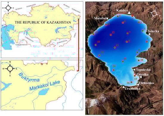Location of Lake Markakol and of the water and sediment sampling points (1–20).