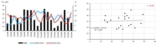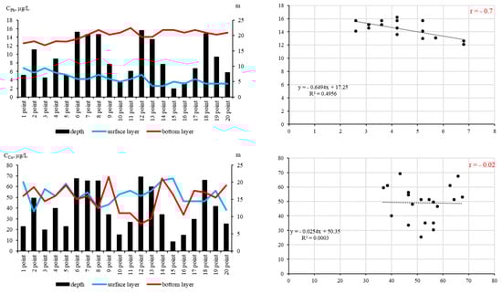 No definite regularity of nickel pollution present in bottom water layers can be traced from the lake depth or from the influence of inflowing rivers. In addition, there is no correlation in the concentrations of cobalt (r = −0.02) and nickel (r = 0.06) between the water layers, as well as in the coefficients of determination (Figure 2), which is associated with the different physical and chemical properties of the metals and processes occurring in the water, such as geological, anthropogenic, chemical factors, and sedimentation or complexation, affecting the distribution of metals in different layers.