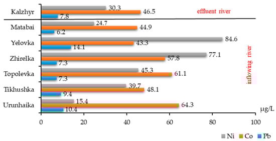 Cobalt was determined in high concentrations in the aquatic environment of the lake: in the surface layer, it was 36.8–67.5 µg/L, and in the bottom layer, it was 25.5–69.2 µg/L. High concentrations of these metals were analyzed throughout the lake water area, especially in the shallow zones influenced by the Tikhushka (67.5 µg/L), Zhirelka (53.0 µg/L) and Yelovka (64.3 µg/L) rivers, and in the bottom water layers of the Tikhushka (53.0 µg/L), Zhirelka (35.2 µg/L) and Yelovka (51.4 µg/L) rivers (Figure 2). High concentrations of cobalt are characteristic of all the inflowing rivers: 43.3 µg/L at Yelovka River; 61.1 µg/L at Topolevka River; 44.9 µg/L at Matabai River; and 64.3 µg/L at Urunhaika River (Figure 3).
