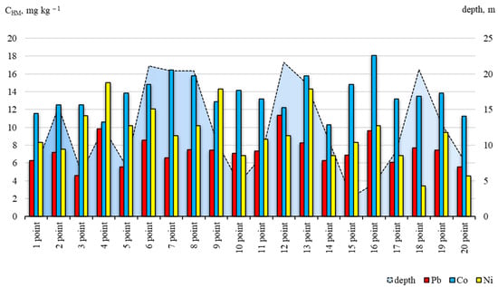 Figure 4 shows high lead concentrations existing in bottom sediments of deep-water areas at depths of 10 m and deeper, up to 21 m, in a range of 8.3–11.4 mg kg−1, also in the zones influenced by the Tikhushka River (point 16) 9.6 mg kg−1 and Topolevka River (point 4) 9.8 mg kg−1. Chemically bound lead in the bottom sediments of a lake is generally a good prerequisite for relatively good Pb storage. However, with higher lead concentrations, there is greater potential for chemical transformation to bioavailable forms of lead, which can be dangerous for aquatic organisms and vegetation. For example, internal water exchange occurring in the lake between the bottom and the surface water body, driven by wind, mud flow, water temperature differences, pH and redox changes or earthquakes can initiate the transformation of chemically bound lead to bioavailable lead [].