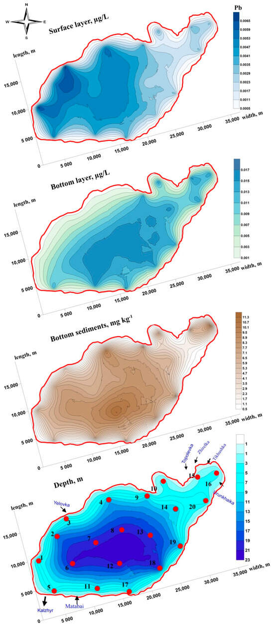 Lead content in the “water-bottom sediments” system (Water surface layer in µg/L, water bottom layer in µg/L, bottom sediments in mg/kg, lake water depth in m) of Lake Markakol. The visualization shown in Figure 5 is a 3D model also presented in the Supplementary Material Figure S1.