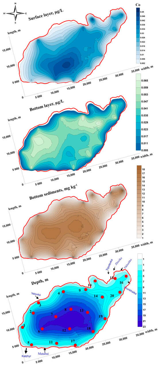 Cobalt content in the “water-bottom sediments” system (Water surface layer in µg/L, water bottom layer in µg/L, bottom sediments in mg/kg, lake water depth in m) of Lake Markakol. The visualization shown in Figure 6 is a 3D model also presented in the Supplementary Material Figure S2.