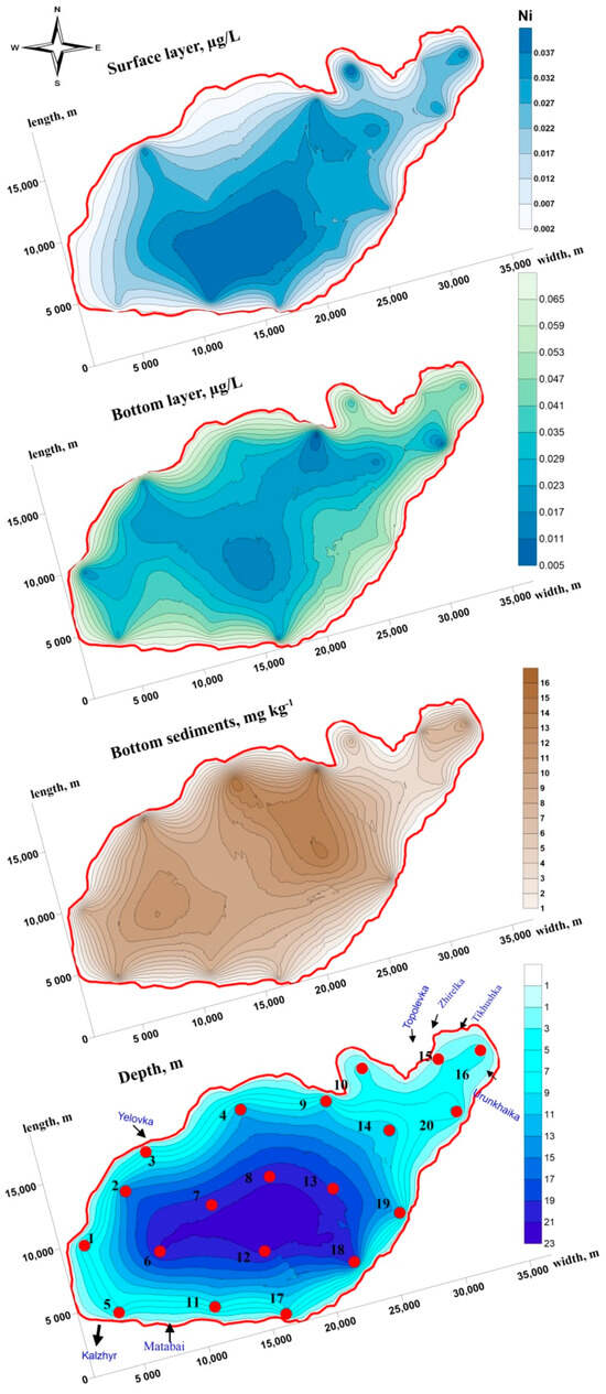 Nickel content in the “water-bottom sediments” system (Water surface layer in µg/L, water bottom layer in µg/L, bottom sediments in mg/kg, lake water depth in m) of Lake Markakol. The visualization shown in Figure 7 is a 3D model also presented in the Supplementary Material Figure S3.