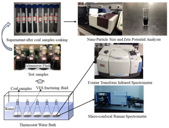 Adsorbed gas in the coal samples was removed using a vacuum extraction device, and the coal samples were then added to the VESFFs outlined in Table 2. Following the mixing process, the coal samples were subjected to a 48 h soaking period in a constant temperature water bath maintained at 313.15 K. The aforementioned soaking temperature is indicative of the temperature of the coal seam at an approximate burial depth of 1000 m. Following the soaking process, the coal particles were subjected to a washing and drying procedure. The coal particles were washed and then placed in an oven at 353.15 K for drying [,].
