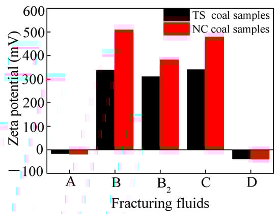 Coal is a structurally complex medium composed of molecules, atoms, and electrons, exhibiting certain surface electrical characteristics. The zeta potential on the coal surface can be altered by the action of ionic VESs. Lin et al. [] explored the effects of zeta potential on coal particle agglomeration and concluded that the control of zeta potential can optimize the agglomeration of coal particles. Liu et al. [] proposed that neutralizing the charge on coal particles can eliminate the electrostatic force between coal particles that have the same charges, which is beneficial for the agglomeration of coal fine particles. It has been demonstrated that VESFFs can influence the pore structure of coal by modifying the zeta potential on its surface. In this paper, the zeta potential of coal treated with VESFFs was measured.