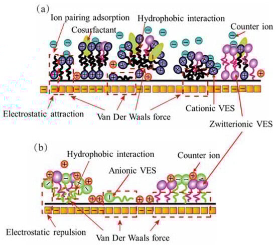 Adsorption mode of VESs on coal surfaces: (a) mixing of cationic–zwitterionic VESs; (b) mixing of anionic–zwitterionic VESs.