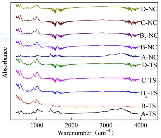 Figure 4 illustrates the FTIR spectra of coal samples from two regions following treatment with FFs. Although the peak intensities were different, it can be seen that the coal subjected to treatment with FFs had similar adsorption peaks. This finding is indicative of the fact that despite the disparate nature of the FFs utilized for the treatment of the coal samples, the types of surface functional groups present within the treated coal samples remain consistent, albeit with varying degrees of abundance. Because the coal samples examined by FTIR spectroscopy were not demineralized prior to the FF treatment, the absorption peaks at 1000–1100 cm−1 in the FTIR spectrum are attributed to the stretching and vibration of -Si-O- groups. The spectral band 1800–2300 cm−1 is the absorption peak of diamond, which is an interference peak and is not discussed.