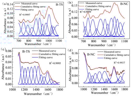 Peak fitting of FTIR spectra of test samples from two regions processed with VESFF B: (a) the absorption peaks at 700–1100 cm−1 of TS coal samples; (b) the absorption peaks at 700–1100 cm−1 of NC coal samples; (c) the absorption peaks at 1100–1800 cm−1 of TS coal samples; (d) the absorption peaks at 1000–1800 cm−1 of NC coal samples.