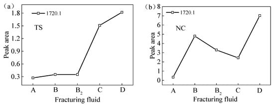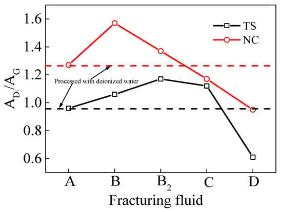 The area of the G peak (AG) in the Raman spectrum of coal can be considered to be an indicator of the number of aromatic rings present in the macro-molecular structure. The area of peak D1 (AD1) is indicative of the degree of molecular order and the number of structural unit defects present in the macro-molecules of coal. The ratio of the peak areas between the D1 and G peaks (AD1/AG) demonstrated an inverse proportional relationship with the size of the macromolecular planar MS of the coal samples [,]. As illustrated in Figure 11, the peak area ratio of the D1 and G peaks (AD1/AG) in the TS coal processed with VESFF D was lower (approximately 0.35) than that of the TS coal processed with deionized water, indicating that the aromatic layer extension in the aromatic crystal nucleus of the TS coal processed with VESFF D and the micropore volume both increased. The ratios of the peak areas of the D1 and G peaks (AD1/AG) for the TS coal processed with VESFFs B, B2, and C were all greater than those for the coal processed with deionized water, decreasing in the following order: B2 > C > B. This result indicates that these three VESFFs destroyed the MS of coal, and the VESFFs composed of VESs with a longer hydrocarbon chain length and cationic–zwitterionic VESs more severely damaged the MS of the coal. As illustrated in Figure 11, the peak area ratios of the D1 and G peaks (AD1/AG) in the NC coal processed with VESFFs C and D were notably lower than those of the coal processed with deionized water, with VESFF D demonstrating the most pronounced impact. This result suggests that VESFFs C and D enhance the aromatic layer extension (La) within the aromatic crystal nuclei of NC coal, thereby enlarging the micropore volume of the coal. Conversely, VESFFs B and B2 were detrimental to the increase in aromatic layer extension (La) within the aromatic crystal nuclei of the NC coal.