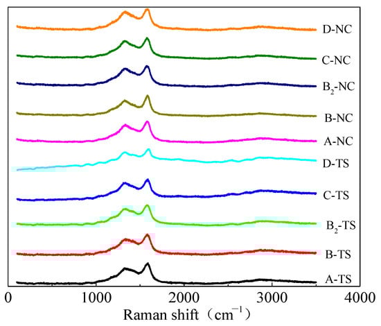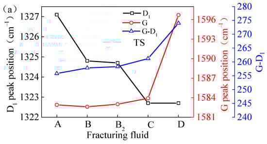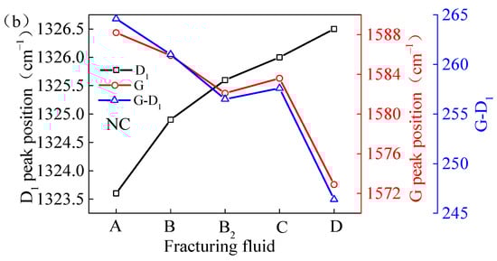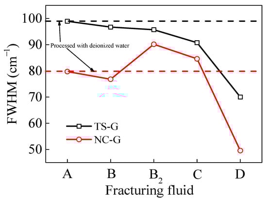 In Raman spectroscopy, the full width at half maximum of the D peak (FWHM-D) and the full width at half maximum of the G peak (FWHM-G) are defined as the spectral line widths at half the maximum peak heights of the D1 and G peaks, respectively [,]. Greater sharpness of the D and G peaks, particularly the G peak, indicates an increase in the size and order of the graphite microcrystals in the coal []. As illustrated in Figure 12, the FWHM-G of VESFF D acting on the coal from two regions exhibited a reduction, indicating that the spacing (d002) between the aromatic ring layers of the macromolecules in the coal processed with VESFF D diminished, and the micropore volume increased. With regard to the TS coal, the sensitivity of the VESFF to the FWHM-G was found to decrease in the following order: D > C > B2 > B. Furthermore, in comparison with the coal processed with deionized water, the interlayer spacing (d002) of the macro-molecular aromatic rings exhibited a reduction. This result indicates that VESFFs B, B2, C, and D increased the micropore volume of the TS coal. A comparison of the interlayer spacing (d002) of the macromolecular aromatic rings in the NC coal processed with VESFF B with that of the coal processed with deionized water revealed a slight reduction in the former. The interlayer spacing (d002) of the macromolecular aromatic rings in the coal processed with VESFFs B2 and C was increased, indicating that the VESs containing longer hydrocarbon chains were not conducive to increasing the micropores in the NC coal.