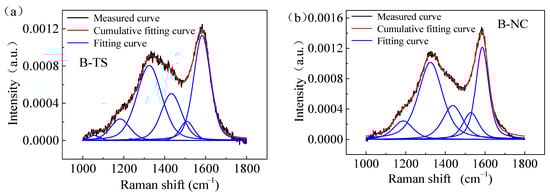 Raman spectra showing peak fitting of coal samples processed with VESFF B: (a) TS coal samples; (b) NC coal samples.