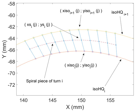 The selection of the structure curves is performed by evaluating the distance () between sampling points of 2 isoHQ (an external one and an internal one ) and linking it with an acceptable distance () equal to the radial tool engagement. If and , Equation (10) is computed: