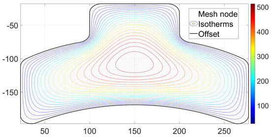 With the conditions exposed in Section 2.4, a temperature field is computed using a finite element method ( nodes). The maximum temperature is around . The mesh and some isotherms are shown in Figure 7. Our following analysis considers 100 of them; note that the temperature rises from the outside to the inside of the pocket.