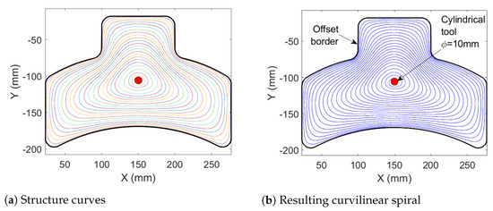 - Romero-Carrillo, P.; Torres-Jimenez, E.; Dorado, R.; Díaz-Garrido, F. Analytic construction and analysis of spiral pocketing via linear morphing. Comput.-Aided Des. 2015, 69, 1–10. [Google Scholar] [CrossRef]