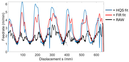 A comparison will be made between the “no fitted” toolpath (called RAW) and the fitted one with HQS method (called HQS). For another comparison point for milling time, a filtered toolpath is also computed, called FIR, and corresponding to a moving average on three points applied twenty times (this combination gives results close to the HQS method). Note that the more the filter is applied, the smoother the trajectory but the more the position control is lost. So, the FIR toolpath is absolutely not suitable to satisfy our goal.