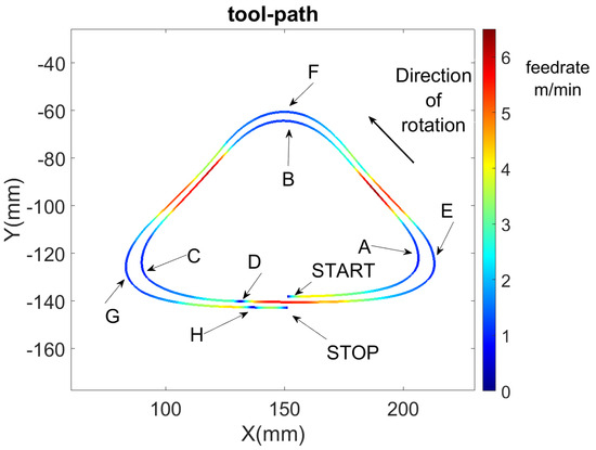 For each zone, three fitting methods are tested (RAW = no fit, FIR = moving average, HQS = Hermite quartic spline interpolation), and the toolpath length and the milling time are collected. The average feed rate is calculated. The programmed feed rate () is fixed at 10,000 [mm/min]. Data are summarized in Table 3, and Figure 11 shows the velocity profile as a function of the curvilinear abscissa for the three intermediate toolpaths (black = RAW, blue = HQS, red = FIR). Figure 12 links the velocity profile with the positions of the tool along the curvilinear spiral turns. Slowdowns for points A, B, C, E, F, G are due to the “high” curvature of the toolpath. D and H are, in fact, the beginnings of a curvilinear spiral turn, and there, as already explained, the connectivity is lost.